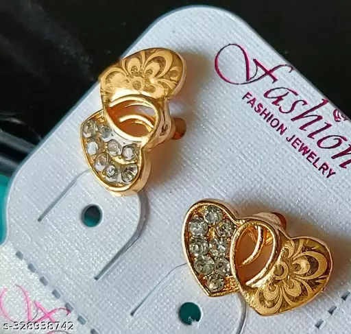 Gold finish interlocked double heart with stones and flower detailing on the other side.
